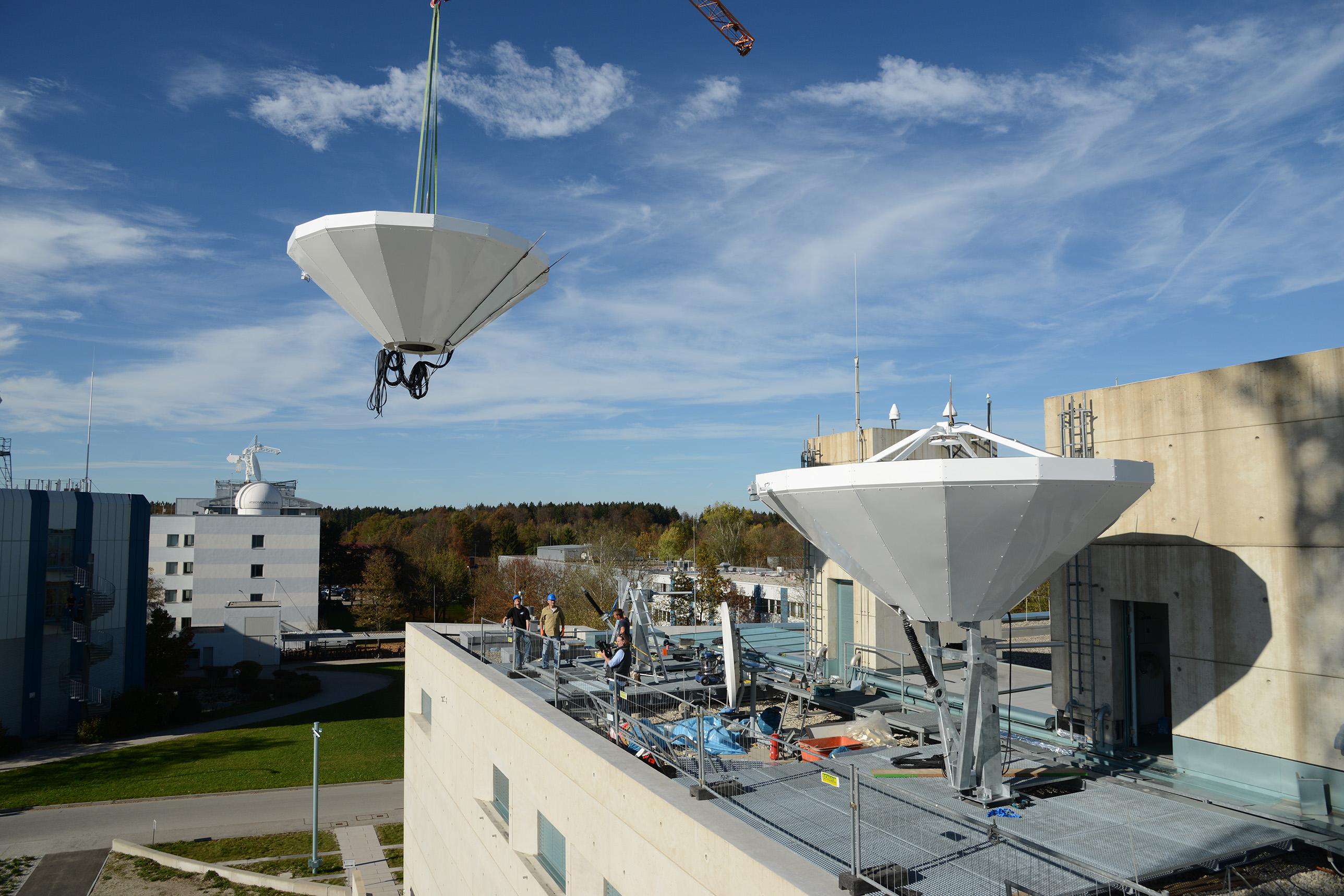 Insgesamt drei Parabolspiegel-Antennen wurden auf dem Dach des Galileo Kontrollzentrums in Oberpfaffenhofen installiert. Sie haben jeweils einen Durchmesser von 4,8 Meter und stellen Kontakt zu Bodenstationen des Galileosystems her - dank einer Verbindung über geostationäre Kommunikationssatelliten.