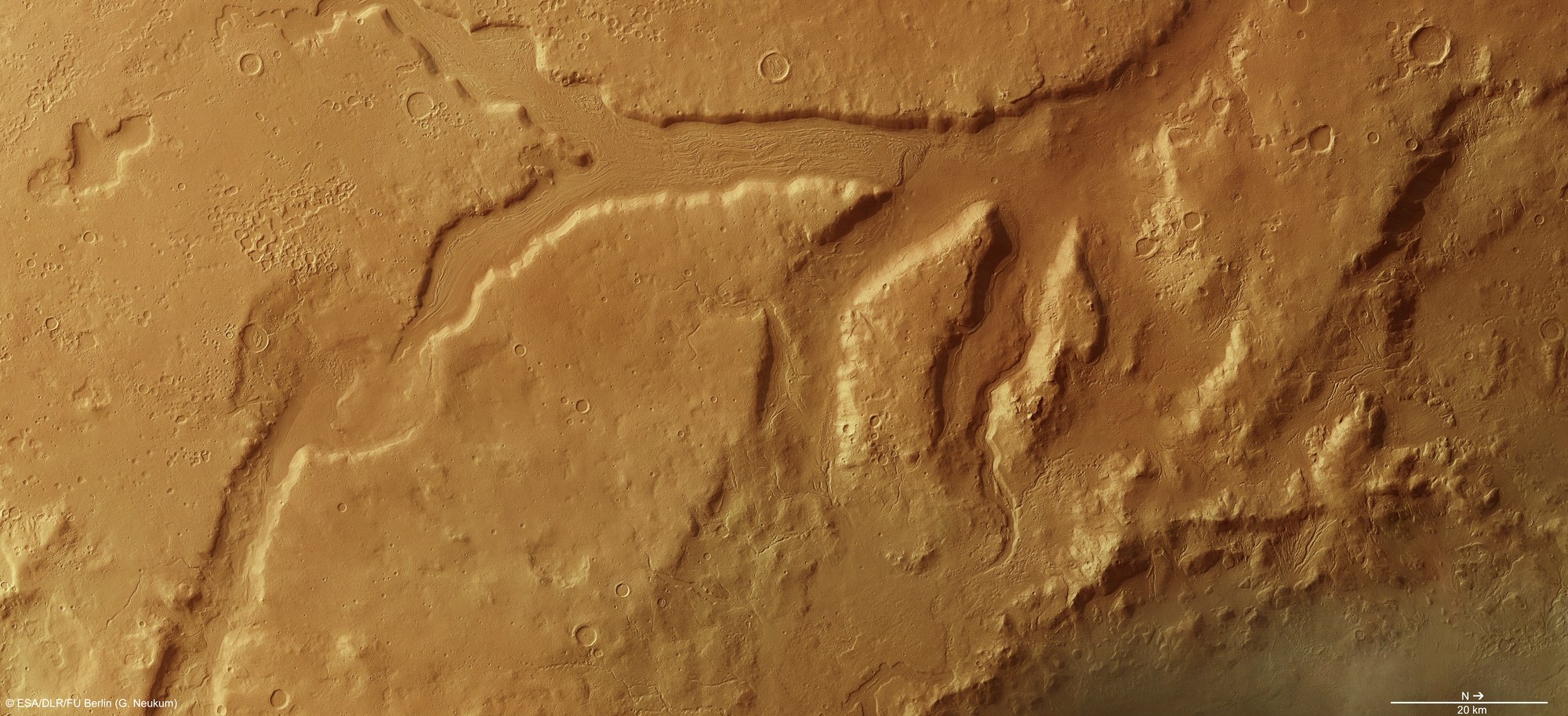 Die Landschaftsformen in der linken (südlichen) Bildhälfte zeigen auffallend wenig topographisches Profil. In den Ausläufern der grabenförmigen Marstäler sind schlierige Strukturen zu sehen, die vermutlich von fließendem Eis herrühren, das von Schutt und Geröll bedeckt war. Rechts unten sieht man den Westrand des Kraters Moreux.