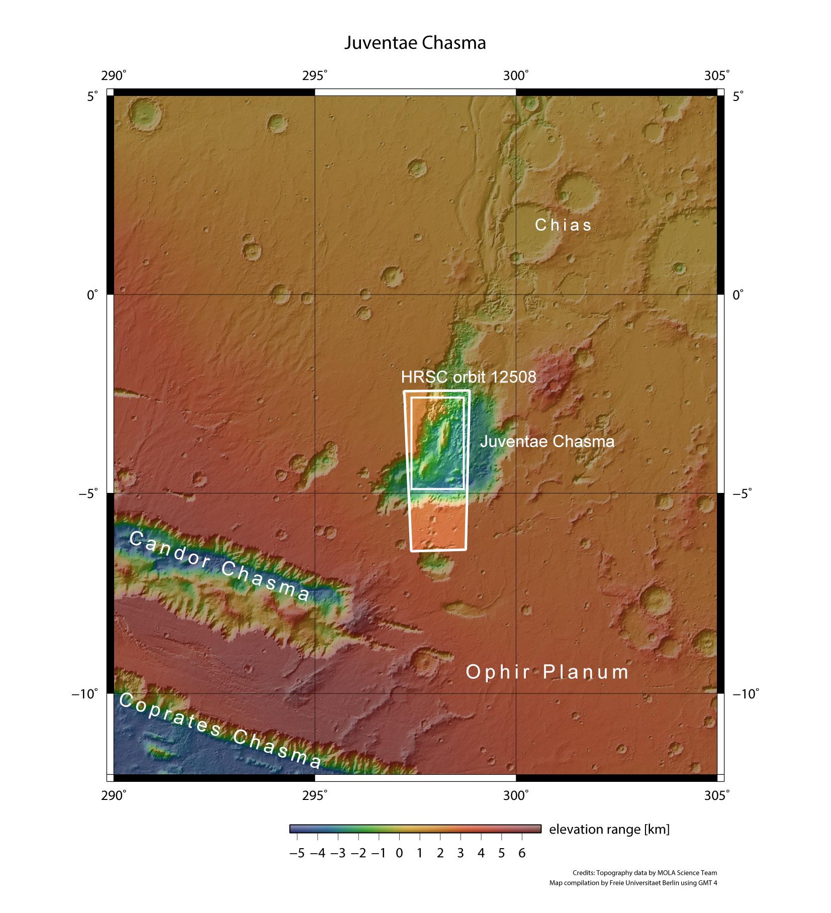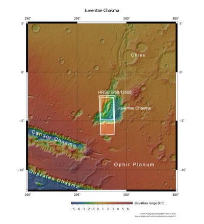 Mit einer Ausdehnung von 150 mal 250 Kilometern bildet Juventae Chasma einen großen Talkessel im Marshochland zwischen den Ebenen von Lunae Planum im Nordwesten und Ophir Planum im Südosten. Nach Norden öffnet sich die bis zu 5800 Meter tiefe Senke zu den Ausflusstälern von Maja Valles. Auf der topographischen Übersichtskarte sind die beiden Bergmassive, die mit der vom DLR betriebenen Stereokamera HRSC auf Mars Express am 4. November 2013 während Orbit 12.508 fotografiert wurden, gut zu erkennen.