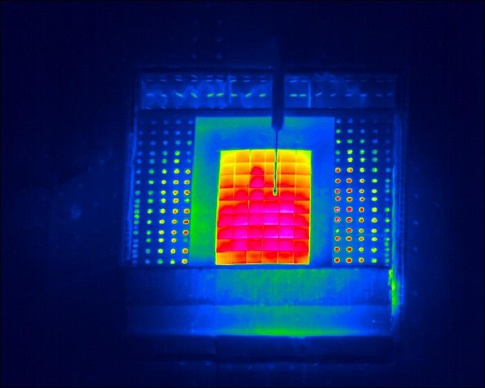 Die Infrarotaufnahme zeigt die Temperaturverteilung auf der Receiver-Oberfläche zwischen ca. 300 Grad Celsius (grün) und 600 Grad Celsius (pink). Bereits in einem der ersten Testläufe Ende September 2013 konnten die Forscher mit dem Textreceiver Heißluft mit Temperaturen über 600 Grad Celsius erzeugen.