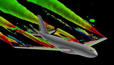 Fortschritte in der Computertechnologie machen es heute möglich, Strömungsverhältnisse wie an diesem Transportflugzeug zu simulieren. Deutlich zu erkennen sind die Wirbel an den Spitzen der Tragflächen und an den Enden der ausgefahrenen Klappen. Das Flugzeug befindet sich in dieser numerischen Simulation in einem Bremsmanöver. Die Bremsklappen spielen eine entscheidende Rolle, wenn etwa ein Notabstieg geflogen werden muss. Der Farbverlauf von Rot zu Grün visualisiert die berechnete Abschwächung der Wirbel.