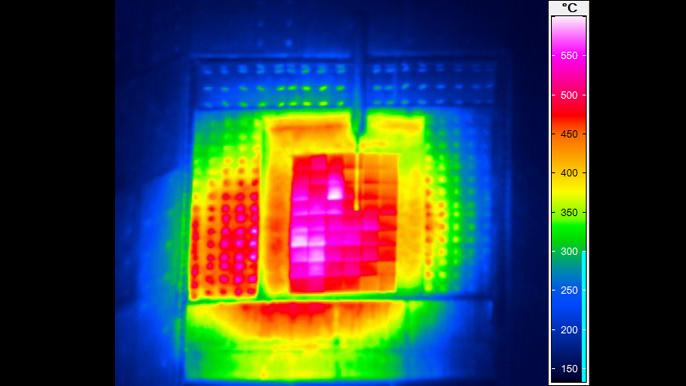 Die Infrarotaufnahme zeigt die Temperaturverteilung (von 150 bis 600 Grad Celsius) auf der Receiver-Fläche. Bereits in einem der ersten Testläufe Ende September erreichen die Forscher Temperaturen über 600 Grad Celsius.