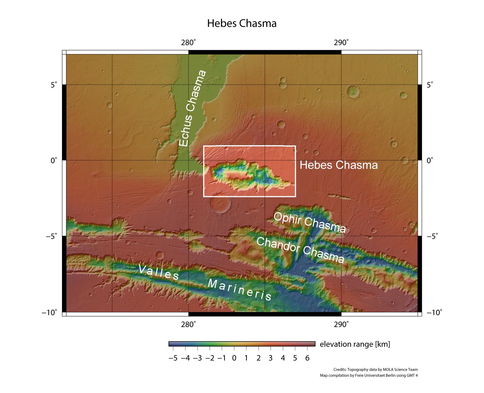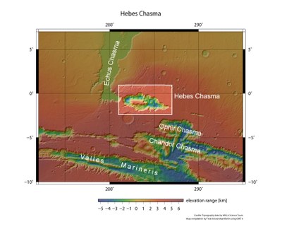 Die vom DLR betriebene Stereokamera HRSC auf der ESA-Raumsonde Mars Express fotografierte Hebes Chasma bei mehreren Überflügen (das in der topographischen Karte markierte Rechteck). Aus acht dieser Aufnahmen wurde nun ein Bildmosaik erstellt, das die gesamten Ausmaße dieser beeindruckenden Landschaftsformation zeigt.