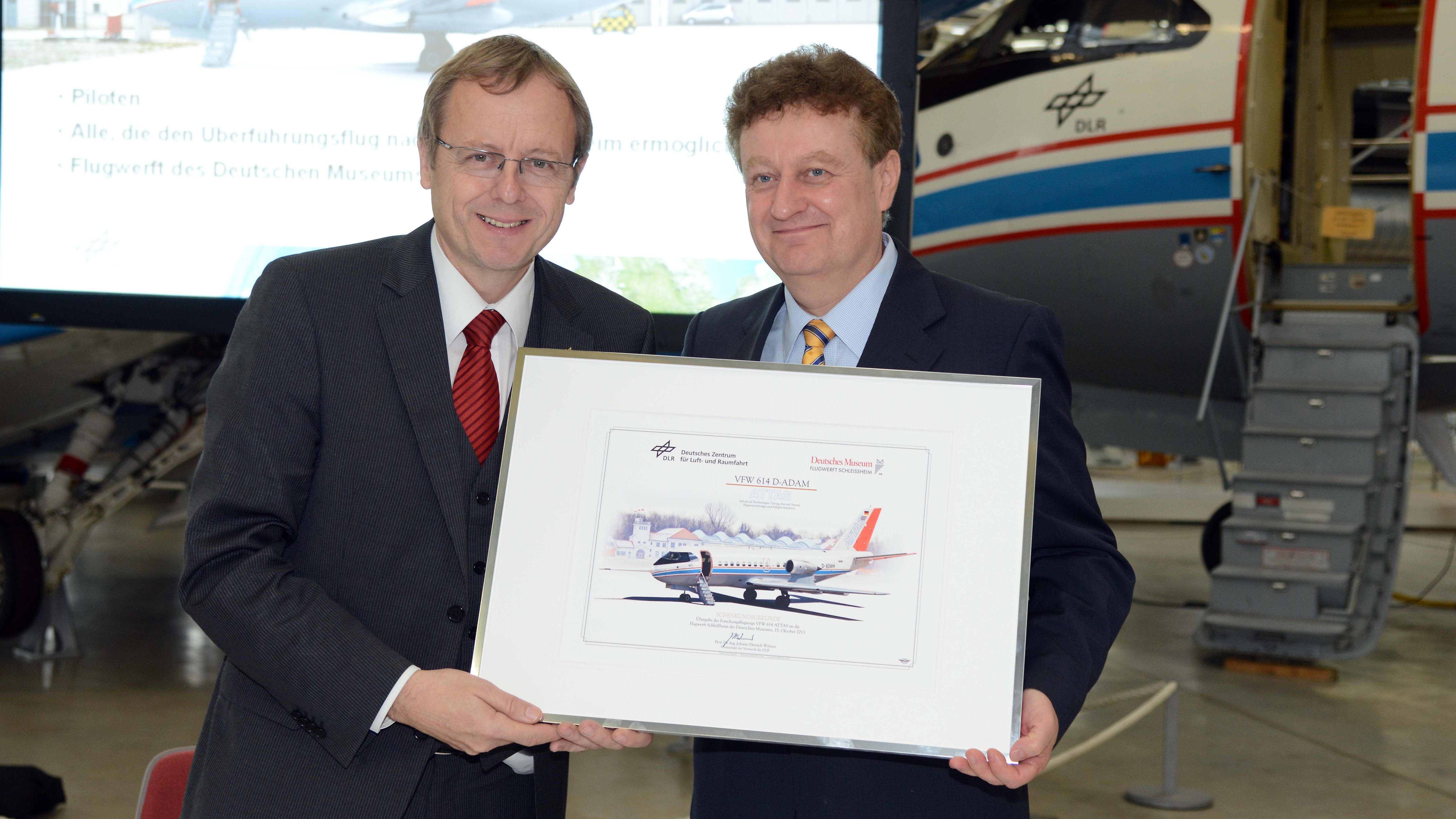 Der DLR-Vorstandsvorsitzende Prof. Dr.-Ing. Johann-Dietrich Wörner übergibt die offizielle ATTAS-Schenkungsurkunde an den Generaldirektor des Deutschen Museums Prof. Dr. Wolfgang M. Heckl.