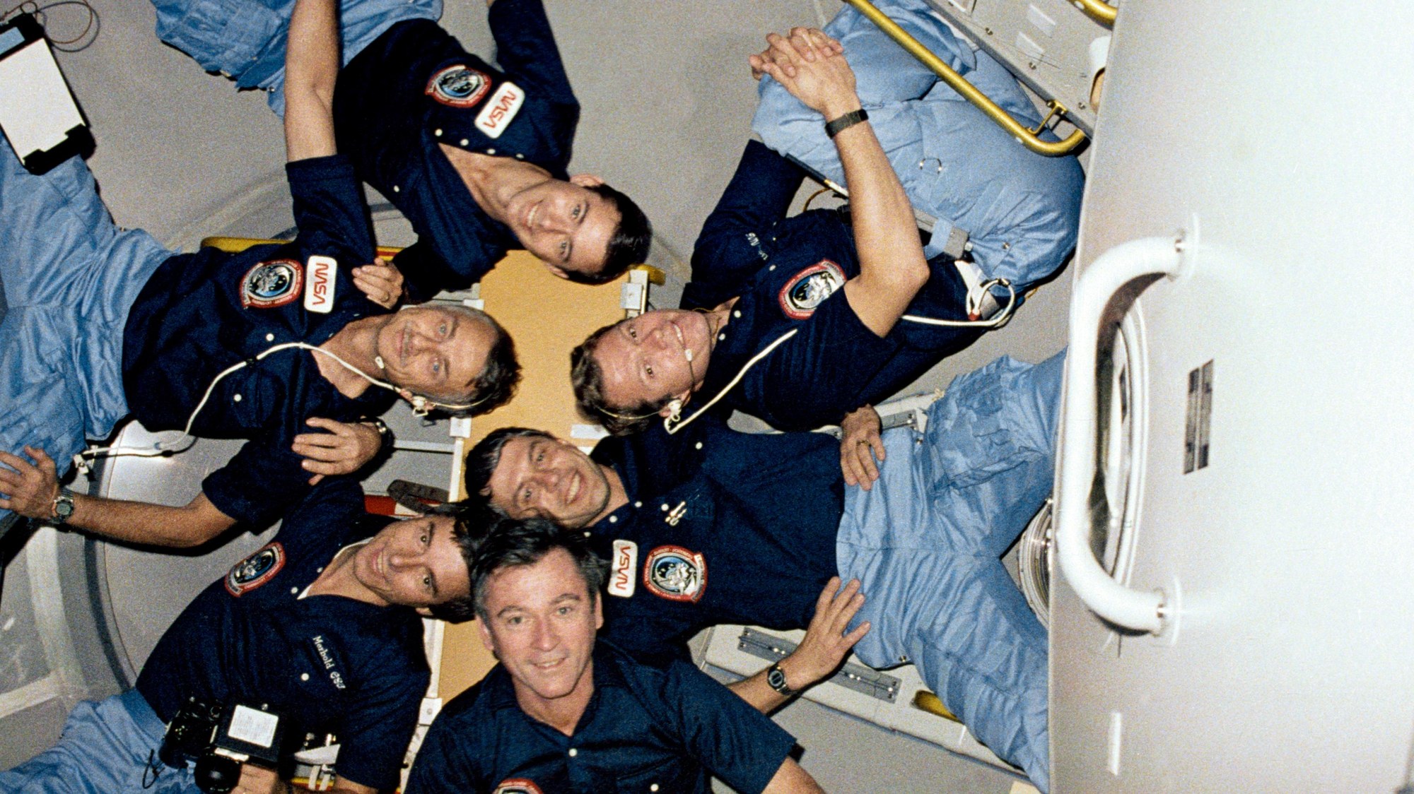 Der deutsche Astronaut Ulf Merbold (unten links) flog mit den Amerikanern John Young, Brewster Shaw, Owen Garriott, Robert Parker und Byron Lichtenberg mit der Spacelab-1-Mission zum ersten Mal ins All.