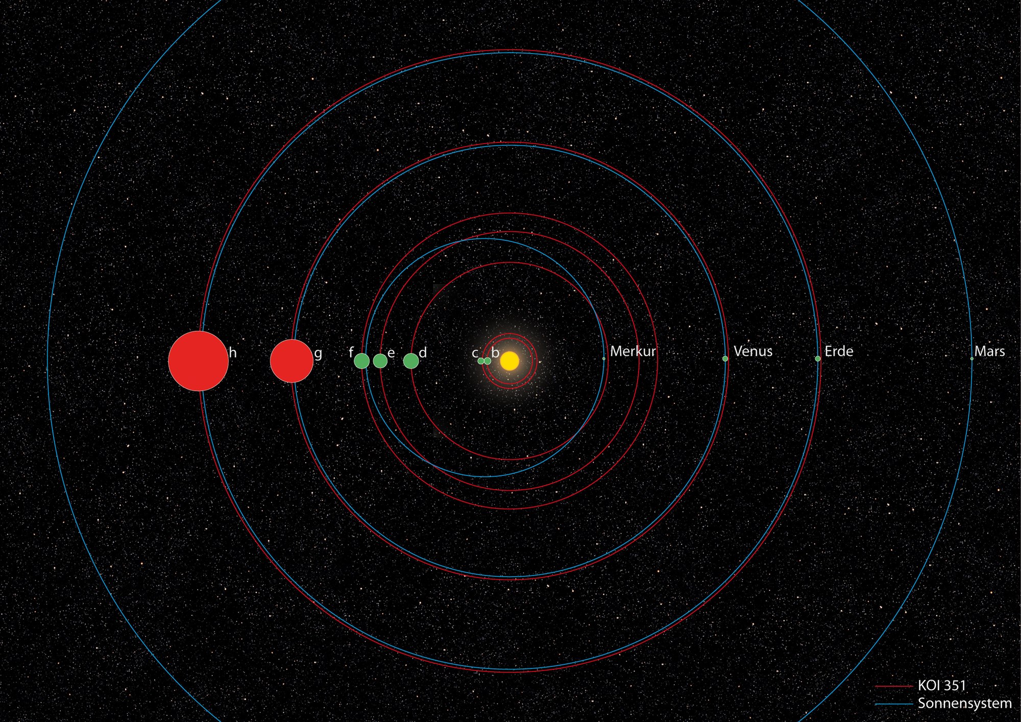 Das Bild zeigt einen Vergleich des Systems KOI-351 mit unserem Sonnensystem. Die Bahnen der Planeten in unserem Sonnensystem sind blau, in KOI-351 rot. Man sieht deutlich, dass die Bahn des äußeren Gasriesen in KOI-351 (rot) in etwa der Erdbahn entspricht. Das ganze System hat trotz seiner sieben Planeten innerhalb der Erdbahn Platz.