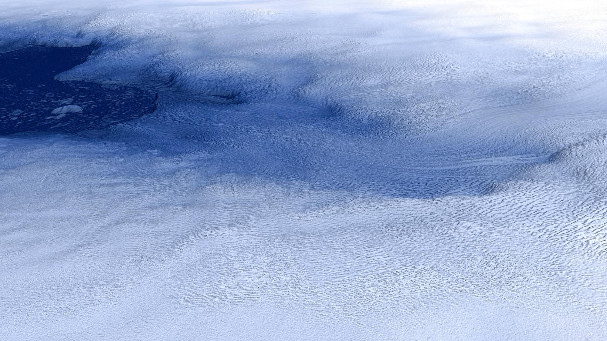 Das digitale Höhenmodel des Jakobshavn Isbrae wurde mit TanDEM-X Satellitendaten berechnet. Das Bild zeigt in detaillierter 3D-Ansicht die komplexe Topographie an der Gletscherfront. Abgebrochene Eisberge werden in den Ilulissat-Eisfjord (links oben) wegtransportiert