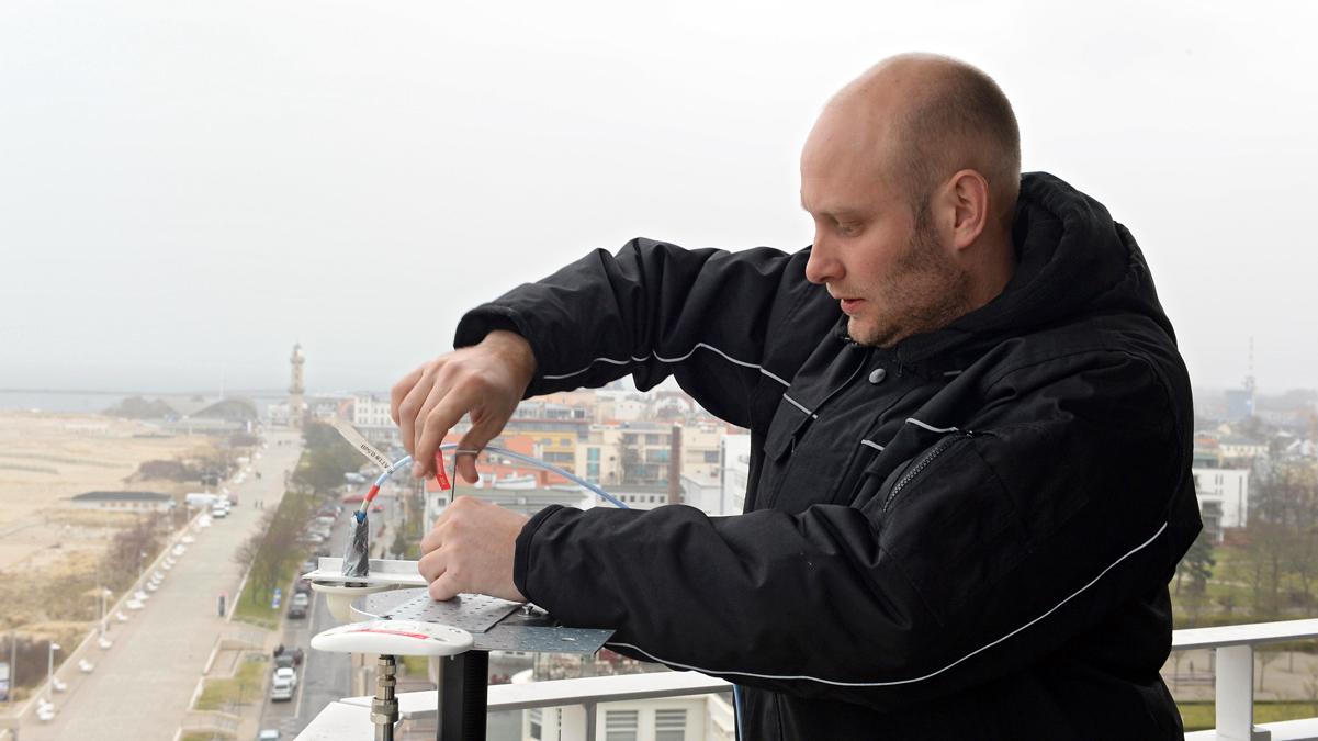 Aufbau zur Funkkanalmessung mit Überblick über Warnemünde und dem Leuchtturm. Der Sende- und Empfangsaufbau ist eine Eigenentwicklung des DLR-Instituts für Kommunikation, das über jahrelange Expertise im Bereich der Wellenausbreitung verfügt.