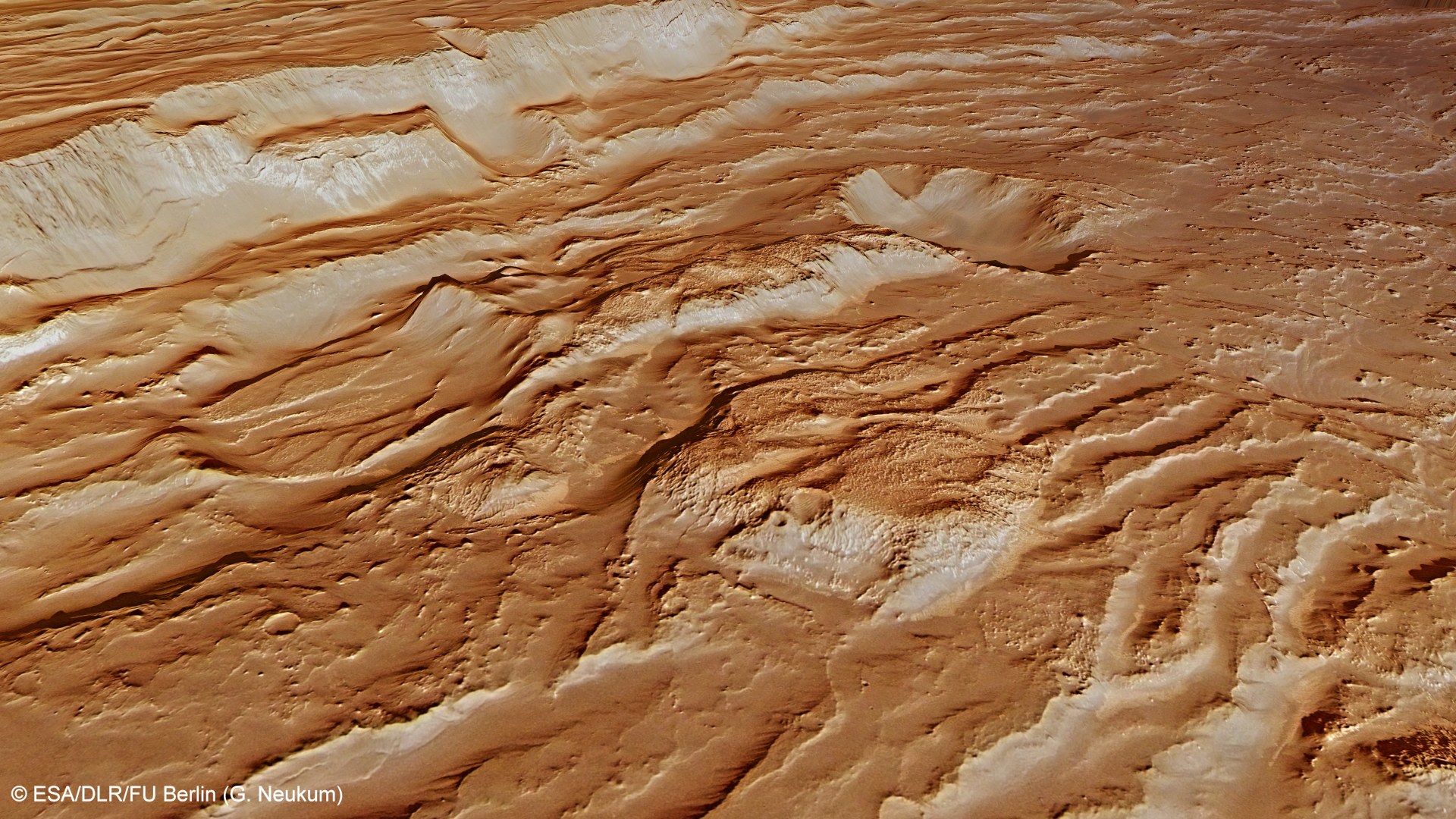 Mit den Stereobilddaten des vom DLR betriebenen Kamerasystems HRSC auf Mars Express ist es möglich, die Landschaft unter verschiedenen Blickwinkeln darzustellen. Auf diesem Bild erkennt man am Steilhang ein helles Material, das wahrscheinlich sogenannte Phyllosilikate (Schichtsilikate) enthält. Hierbei handelt es sich um Tonminerale, die reich an Eisen und Aluminium sind und die nur unter längerer Einwirkung von Wasser auf vulkanisches Gestein entstehen.