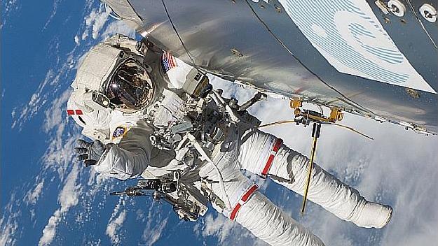 Astronaut Randolph Bresnik hinter der COLAIS-Antenne am Columbus-Modul