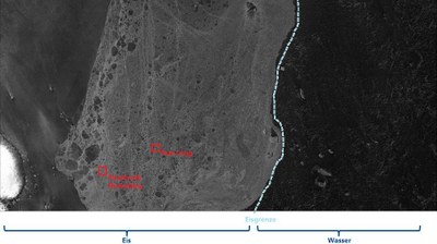 Die Satellitenaufnahme deckt eine Fläche von 100 x 55 Kilometern ab. Das russische Forschungsschiff Akademik Shokalskiy und der chinesische Eisbrecher Xue Long stecken in einer Packeiszone fest, die im TerraSAR-X Bild hell bis „schuppig“ erscheint. Das offene Wasser befindet sich in östlicher Richtung (rechts im Bild) zirka 25 Kilometer von den Schiffen entfernt.