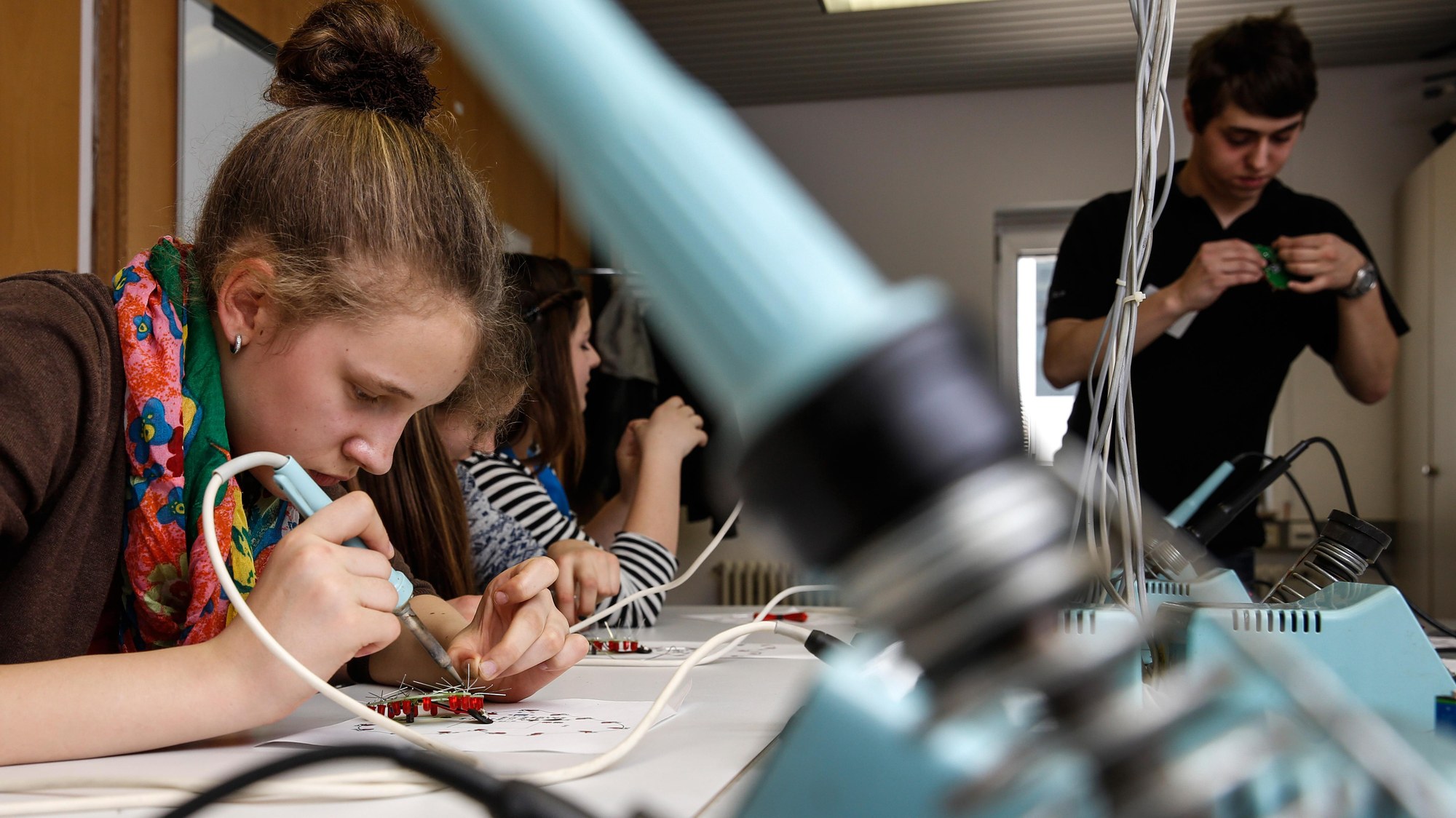 In der Lehrwerkstatt für angehende Systemelektroniker und Systemelektronikerinnen des DLR in Stuttgart bestücken die Girls'Day-Teilnehmerinnen unterschiedliche elektronische Bauteile auf eine Platine in Herzform. Im Anschluss können sie sich den "Pulsschlag" ihres Herzens mit dem Oszilloskop anschauen.