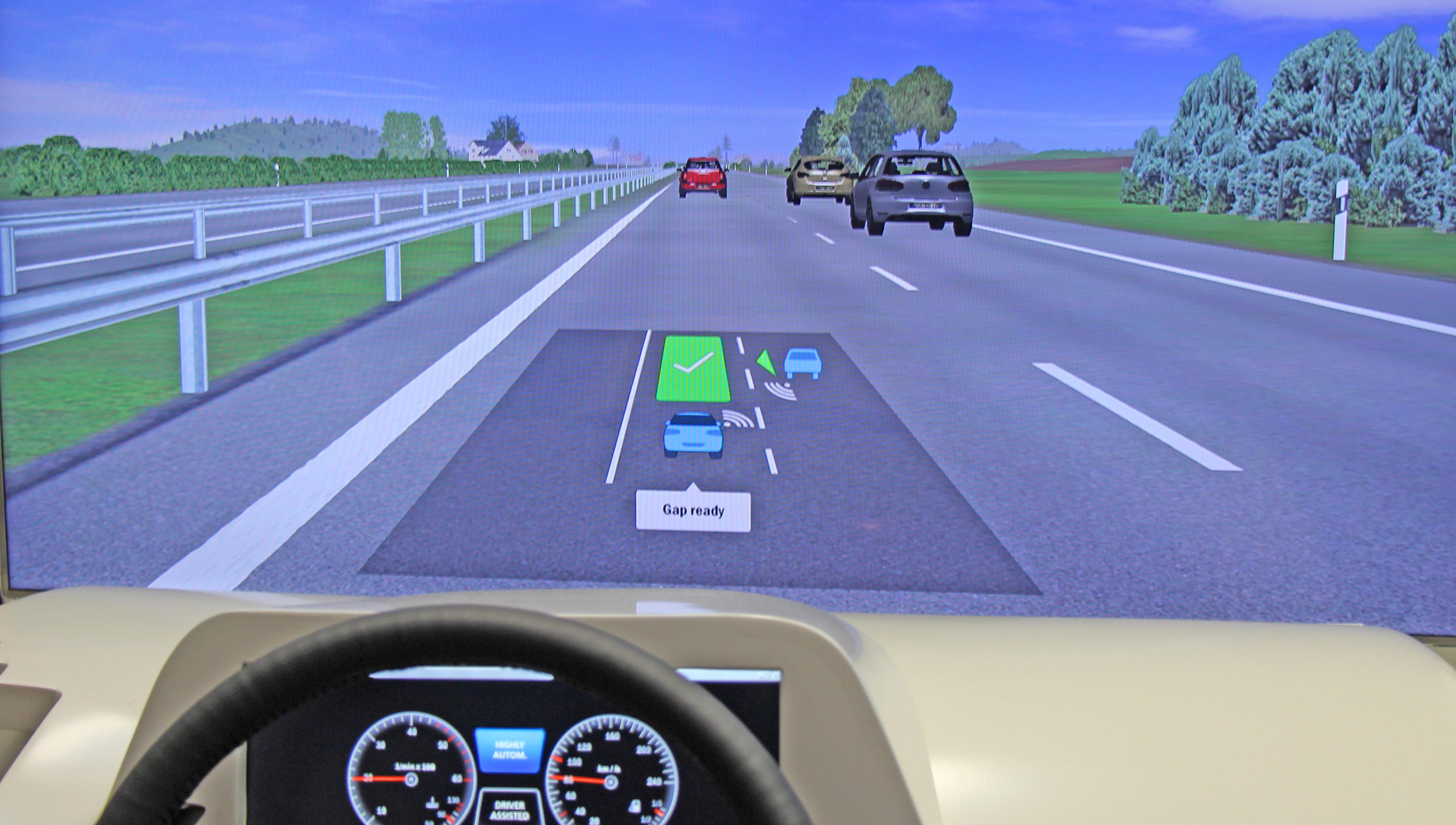 Im Head-Up-Display wird dem Fahrer jeder Schritt des Spurwechselvorgangs bildlich angezeigt.