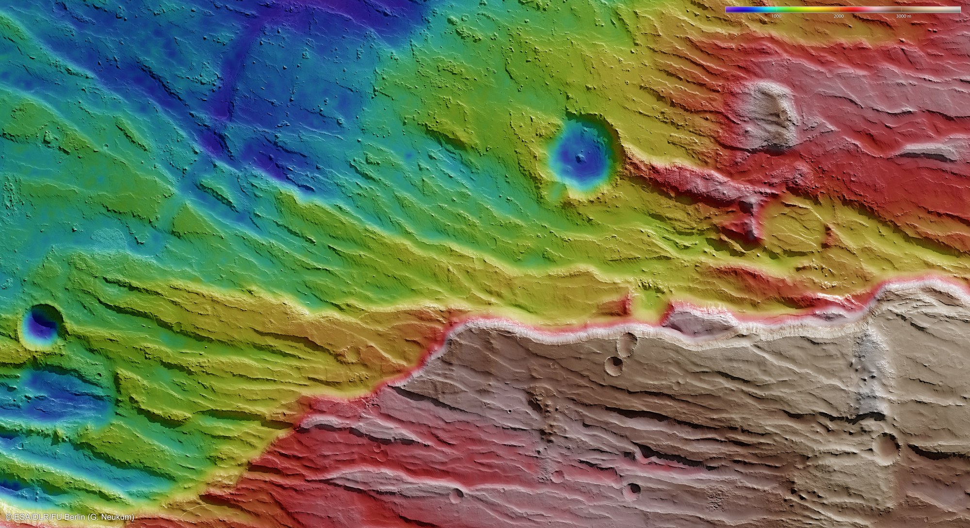Aus den Stereobilddaten des vom DLR betriebenen Kamerasystems HRSC werden topographische Geländemodelle abgeleitet. In dieser Falschfarbendarstellung (Bildlegende oben rechts) ist eindrucksvoll die Abbruchkante von Claritas Rupes zu erkennen.