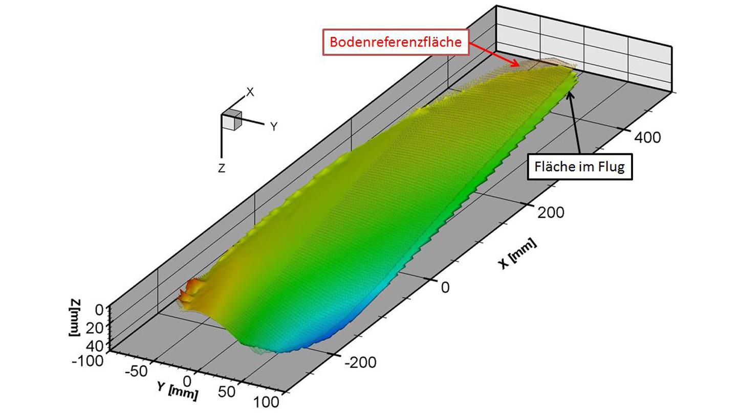 Computerdarstellung der im Flug ermittelten Propelleroberfläche. Gegenüber dem Zustand am Boden (Bodenreferenzfläche) ist eine Durchbiegung erkennbar.