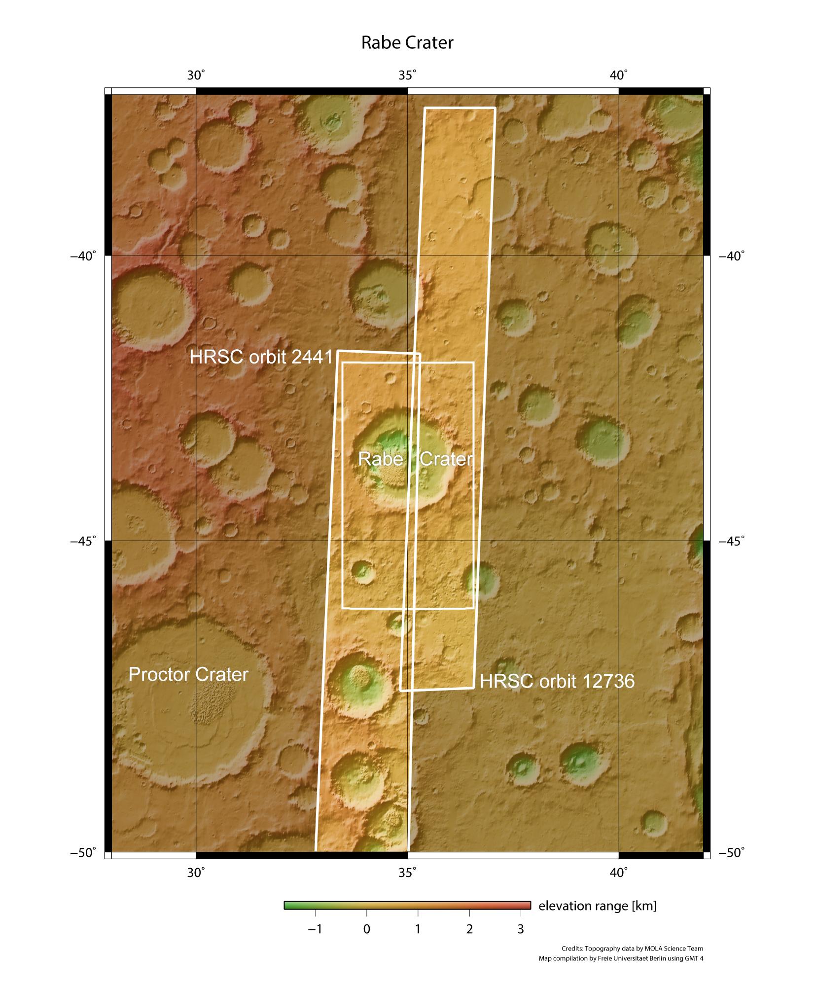 Die topographische Übersichtskarte zeigt den Krater Rabe auf dem Mars. Dieser Krater (benannt nach dem Astronomen Wilhelm Rabe, 1893-1958, ehemaliger Leiter der Münchner Universitätssternwarte in Bogenhausen) befindet sich etwa 320 Kilometer westlich des gigantischen, über 2000 Kilometer großen Einschlagskraters Hellas Planitia im südlichen Marshochland. Die Aufnahmen mit der HRSC (High Resolution Stereo Camera), die für dieses Bildmosaik verwendet wurden, entstanden während der Orbits 12.736 und 2441 von Mars Express.