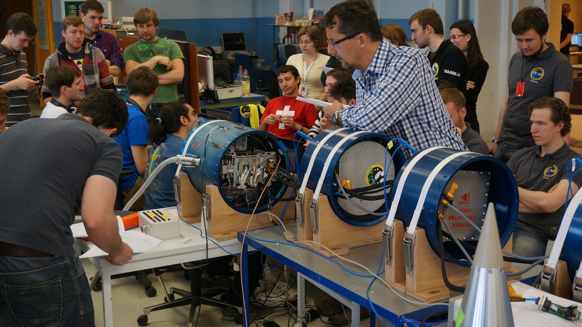 In der Raketenhalle am Startplatz Esrange verfolgen die Studententeams von REXUS 16 aus Deutschland, Rumänien, Belgien und Italien mit Spannung den Kommunikationstest zwischen ihren Experimentmodulen und dem Service-Modul (Mitte). Rechts unten im Bild ist die Raketenspitze zu sehen.