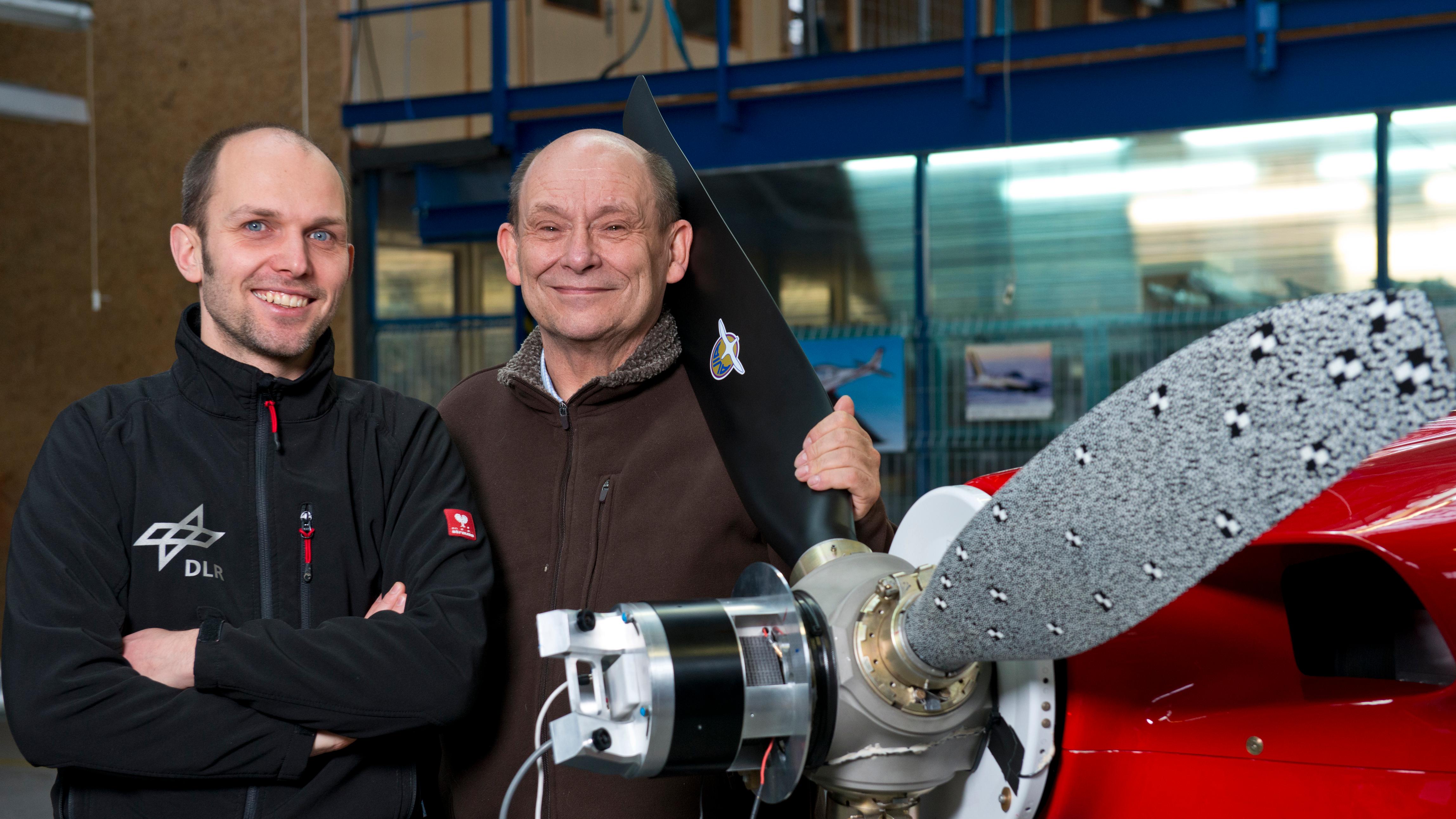 Fritz Boden (li.) und Boleslaw Stasicki vom DLR-Institut für Aerodynamik und Strömungstechnik vor ihrer Erfindung, einer rotierenden Kamera, die in der Nabe eines Propellers untergebracht wird. Damit haben sie erstmals die Verformung eines Propellers im Flug sichtbar gemacht.
