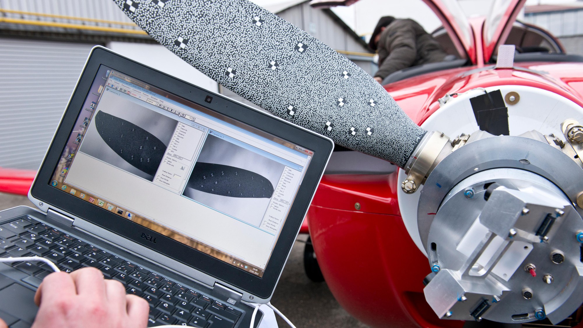 Das Kamerasystem ist auf das Propellerblatt ausgerichtet und dreht sich synchron mit. Per WLAN werden die Bilder an einen Computer übertragen.