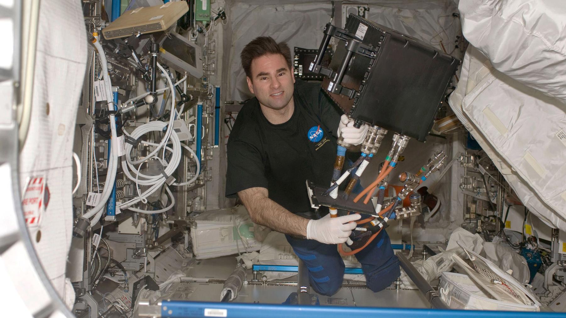 Astronaut Greg Chamitoff installiert den GeoFlow-Experimentcontainer im Columbus-Modul der Raumstation.