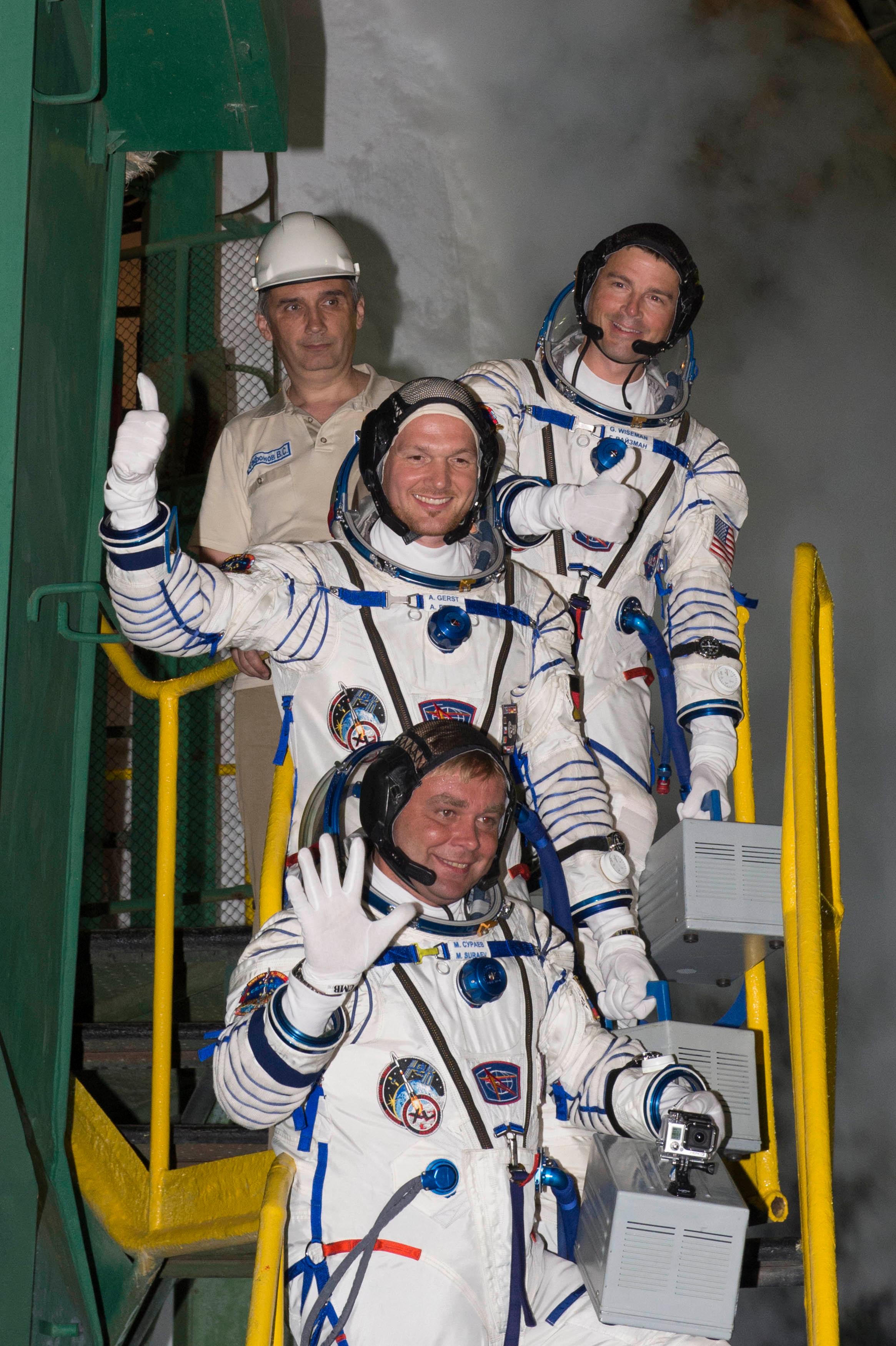 Kurz bevor sie in den Aufzug einsteigen, der sie bis zur Spitze der Sojus-Trägerrakete bringt, grüßen die drei Besatzungsmitglieder der Expedition 40/41 zur ISS noch einmal.