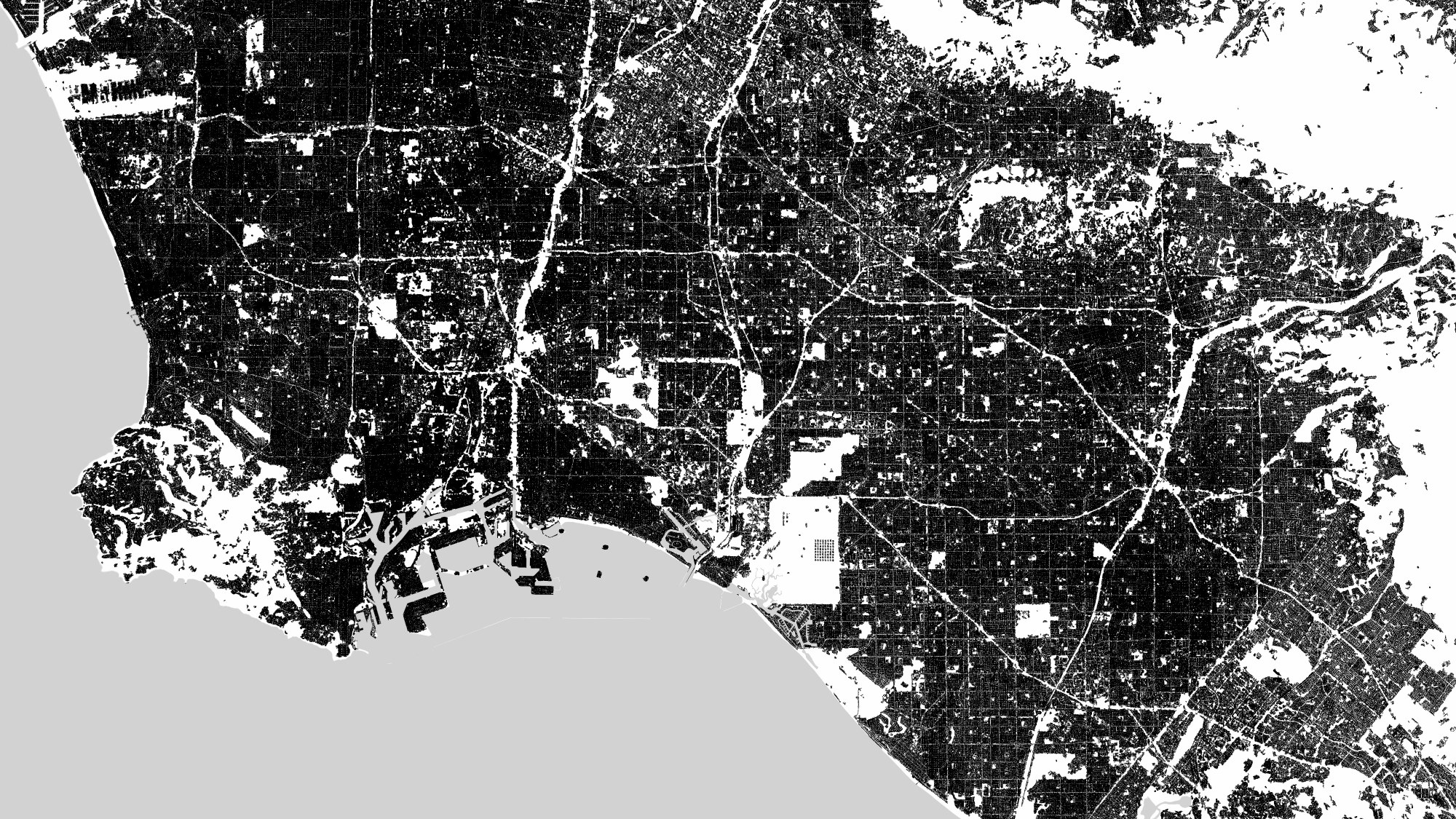 Die amerikanische Metropole Los Angeles breitet sich auf einer riesigen Fläche aus. Da vertikale Strukturen die Radarstrahlen der Satelliten TerraSAR-X und TanDEM-X des DLR besonders gut reflektieren, zeigt diese Karte, dass Los Angeles besonders dicht und meist blockweise bebaut ist. Weiß erscheinen Flächen ohne vertikale Strukturen wie Autobahnen oder Flughäfen.