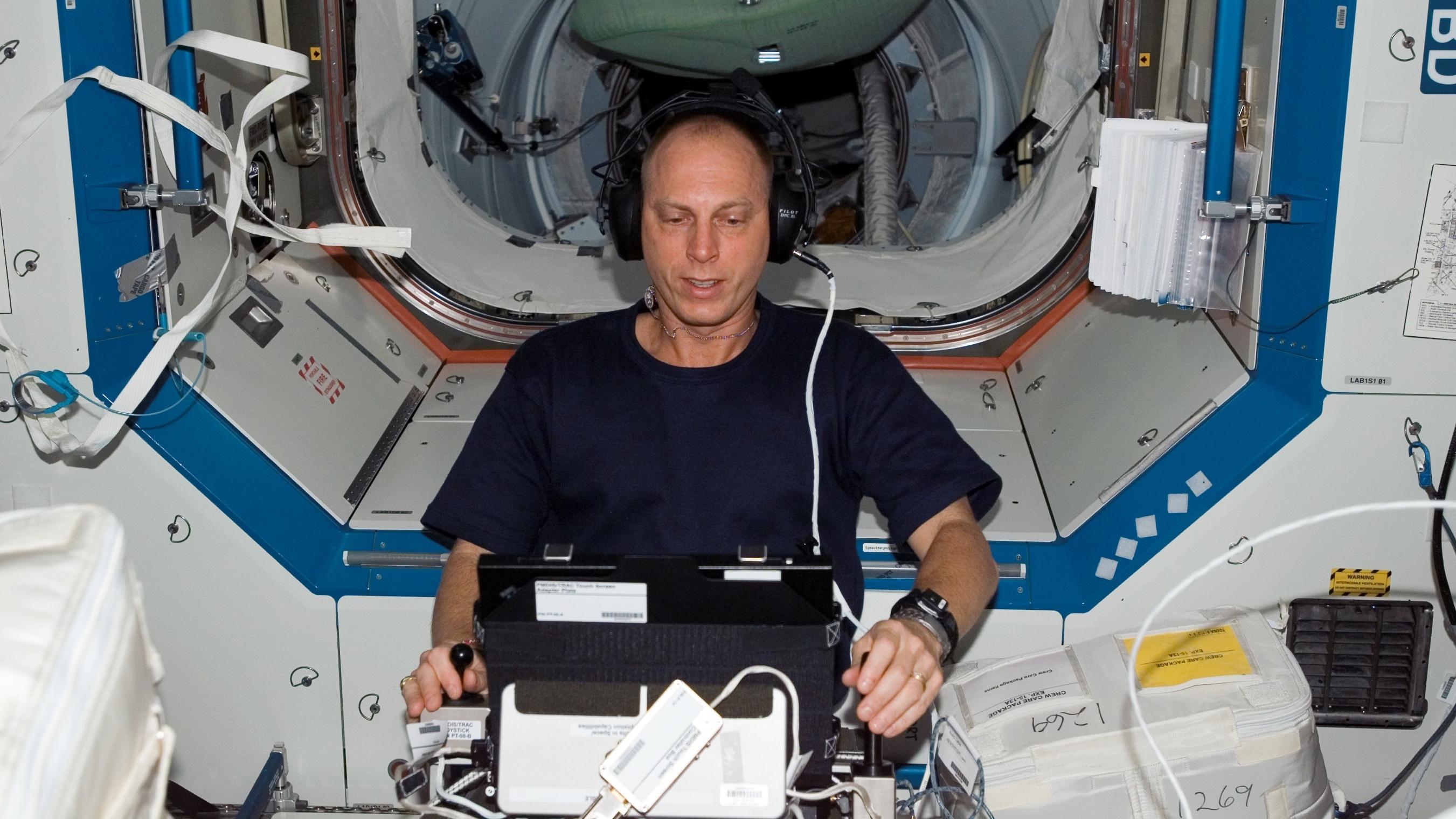 Astronaut Clayton Anderson führt das Perceptual-Motor Deficits in Space (PMDIS) Experiment im US-amerikanischen Destiny-Labor durch.