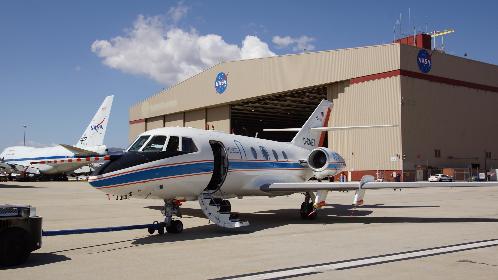 Am Morgen wird die DLR-Falcon vor einem Forschungsflug auf das Vorfeld des Armstrong Flight Research Center am Standort Palmdale/Kalifornien gezogen. Die Falcon ist für eine gemeinsame Forschungsmission mit der NASA im selben Hangar wie das fliegende Stratosphärenobservatorium Sofia untergebracht.