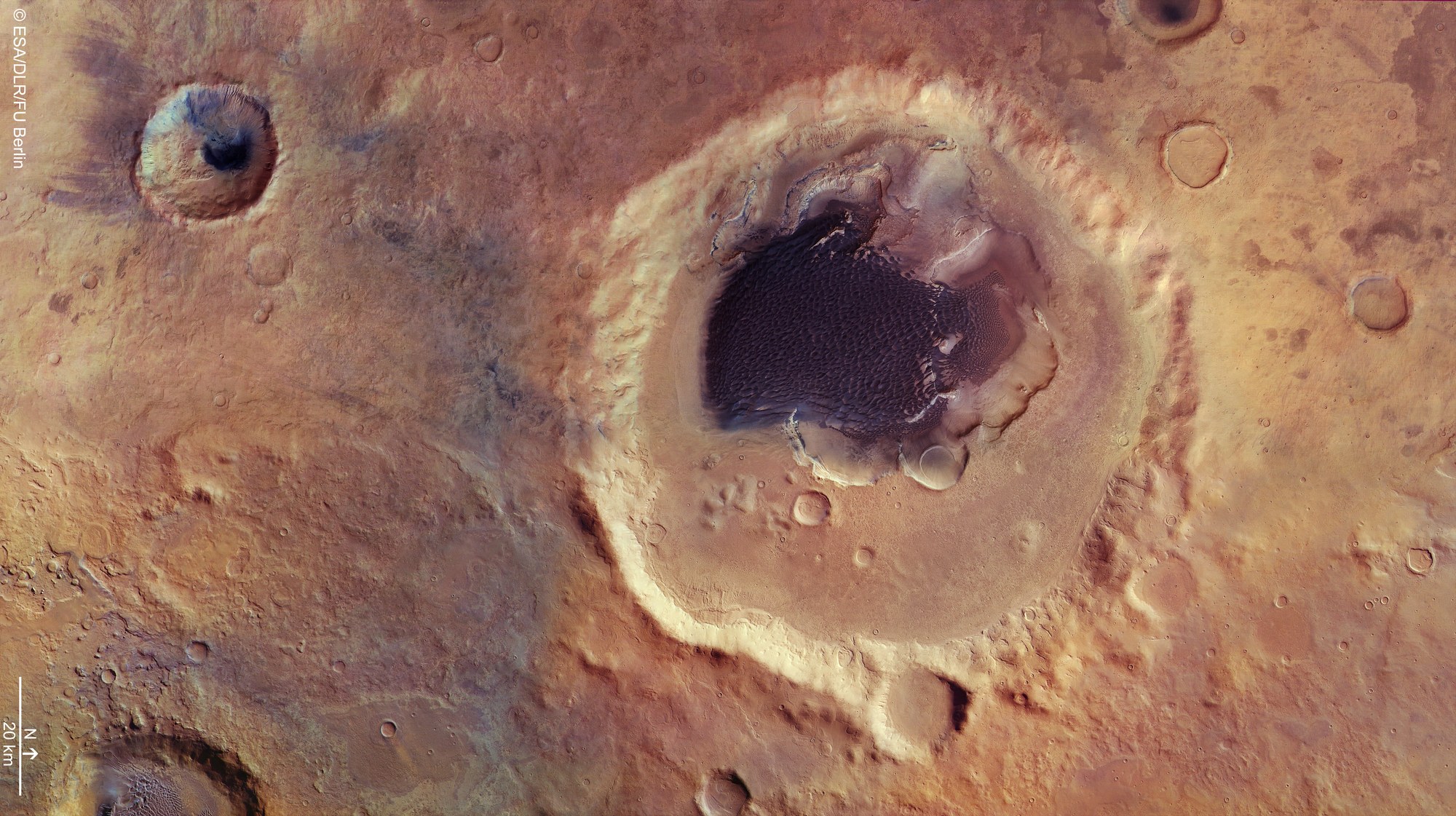 In der Mitte des etwa 100 Kilometer großen Kraters Rabe auf dem Mars befindet sich ein riesiges Feld schwarzer Dünen, die bis zu 200 Meter hoch sind. Diese feinsandigen, dunklen Dünen bestehen aus alter vulkanischer Asche. Die Dünen werden aufgrund ihrer Zusammensetzung aus vulkanischen Mineralen auch "basaltische Dünen" genannt und sind vielerorts auf dem Mars zu finden. Basalte sind das häufigste vulkanische Gestein auf dem Mars. Auf der Erde findet man solche Dünen nur sehr selten, beispielsweise auf Hawaii. Sie existieren nur dort, wo Vulkanismus in einem trockenen Klima stattfindet. Die Umgebung von Rabe wurde durch die Erosion stark verändert, einige sehr alte Krater sind nur noch an ihren Umrissen zu erkennen. Die Bildauflösung beträgt etwa 15 Meter pro Bildpunkt (Pixel).
