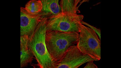 Thyroid-Krebszelllinie FTC-133 nach vier Stunden simulierter Schwerelosigkeit. Zellkerne sind blau, Komponenten des Zytoskeletts grün und rot dargestellt.