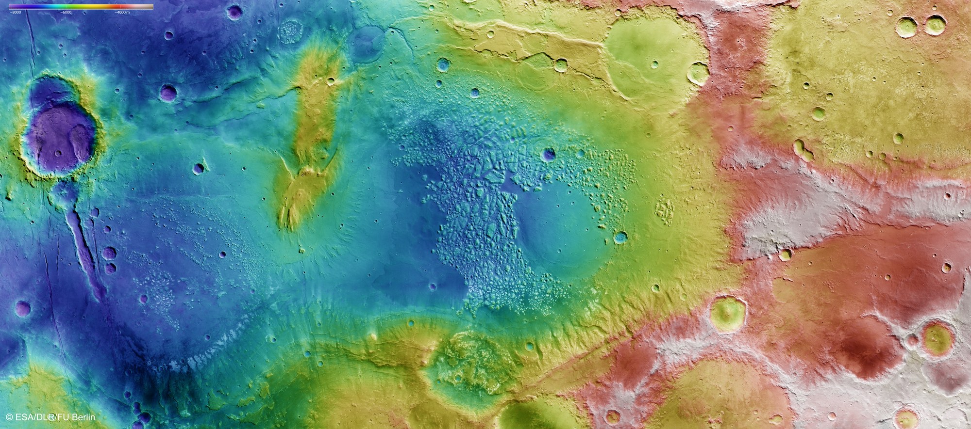 Aus den Stereobilddaten des vom DLR betriebenen Kamerasystems HRSC werden topographische Geländemodelle abgeleitet. In der farbkodierten Darstellung lassen sich die Höhenunterschiede von über 4000 Metern in der Region gut erkennen. Auffallend ist eine Art "Kanal", durch den das Atlantis-Becken in der Bildmitte mit einem weiter südlich (links im Bild) gelegenen, kleineren Becken verbunden ist. Vermutlich befand sich in den Senken einst ein stehendes Gewässer.