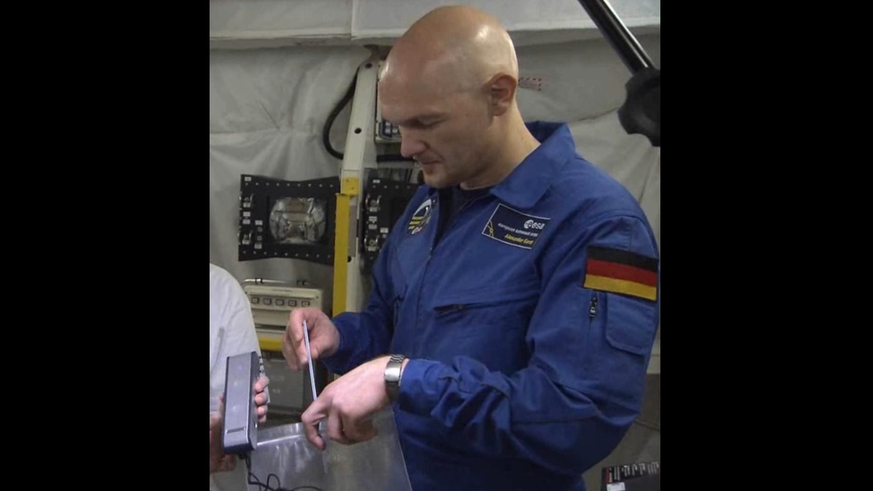 Astronaut Alexander Gerst übte am Boden, wie er an Bord der Schwerelosigkeit ein Schülerexperiment mit Seifenblasen durchführen soll.