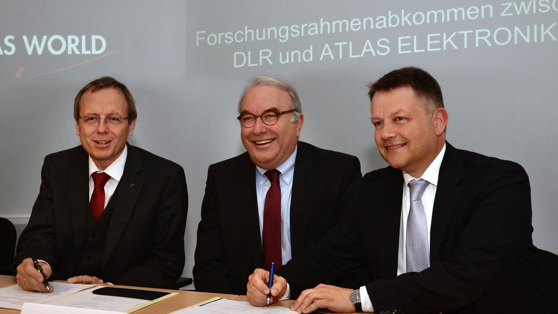 Unterzeichnung der Kooperationsvereinbarung zwischen dem DLR und der ATLAS ELEKTRONIK GmbH: (v.l.n.r.) Prof. Dr. Johann-Dietrich Wörner, Uwe Beckmeyer, MdB, Volker Paltzo
