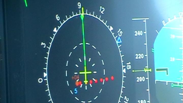 Navigations-Display: Die roten Punkte zeigen die Position der gerade durchgeflogenen Wirbelschleppe an.