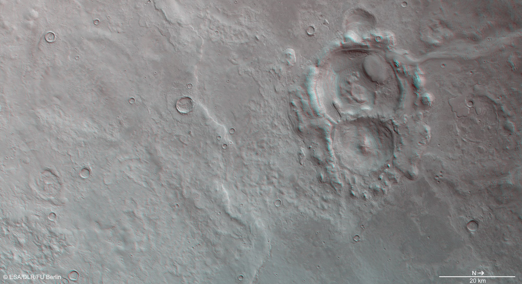 Aus dem senkrecht auf die Marsoberfläche gerichteten Nadirkanal des vom DLR betriebenen Kamerasystems HRSC und einem der vier Stereokanäle lassen sich sogenannte Anaglyphenbilder erstellen, die bei Verwendung einer Rot-Blau- oder Rot-Grün-Brille einen realistischen, dreidimensionalen Blick auf die Landschaft ermöglichen. Bei näherer Betrachtung des Doppelkraters in der rechten Bildhälfte lässt sich die Morphologie von verschiedenen, ungewöhnlichen glazialen Strukturen erkennen.