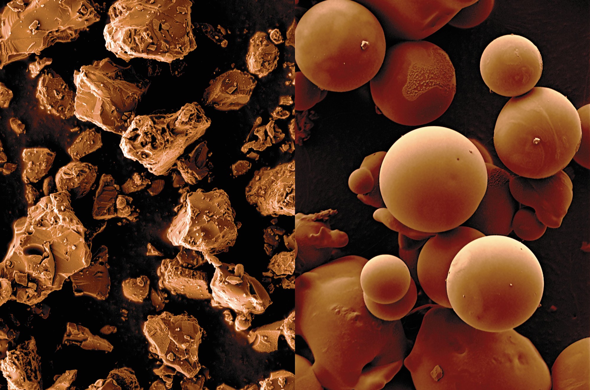 Splitterförmig zeigen sich die Aschepartikel des Vulkans Eyjafjallajökull unter dem Elektronenmikroskop (links), beim Durchqueren einer circa 1.700 Grad Celsius heißen Flamme wandeln sie sich schnell in Gefahr bringende Schmelztröpfchen um (rechts).