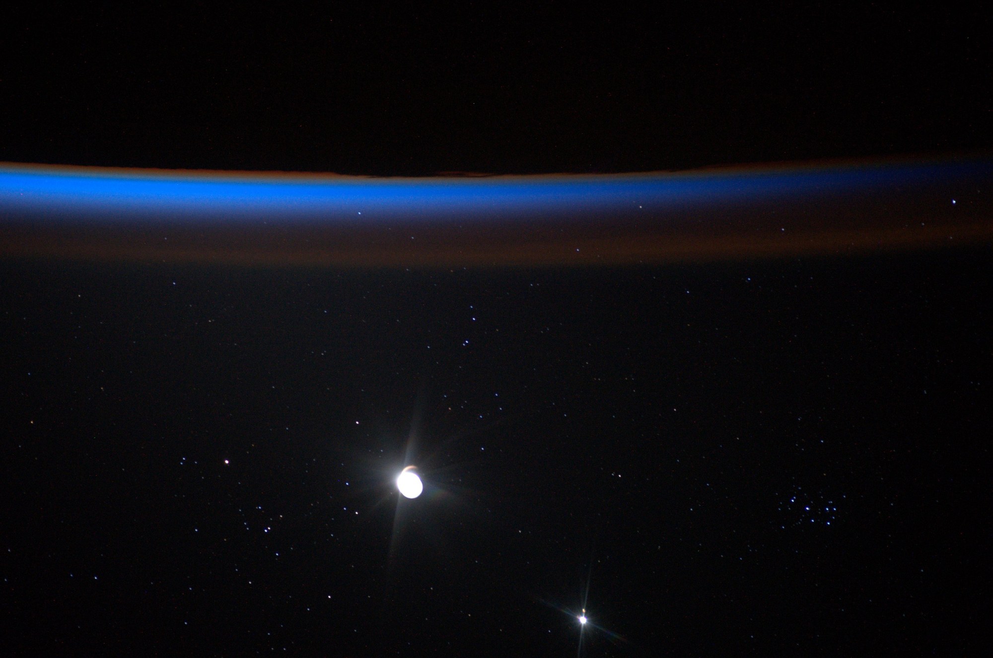 Alexander Gerst, der dieses Bild am 24. Juni 2014 aufgenommen hat, konnte hier gut zeigen, dass Sterne wild blinken, wenn sie durch die Atmosphäre aufgehen. Danach flackern sie gar nicht mehr.