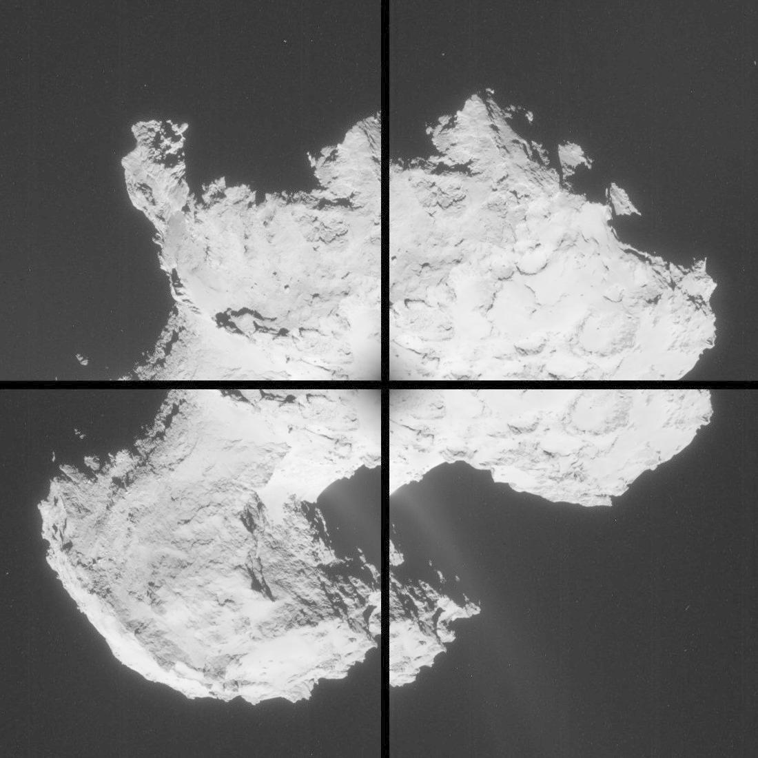 Montage aus vier Einzelaufnahmen, die die Navigationskamera (NavCam) an Bord der Raumsonde Rosetta am 2. September 2014 vom Kometen 67P/Churyumov-Gerasimenko gemacht hat. Sie entstanden aus etwa 56 Kilometern Entfernung zum Kometen.