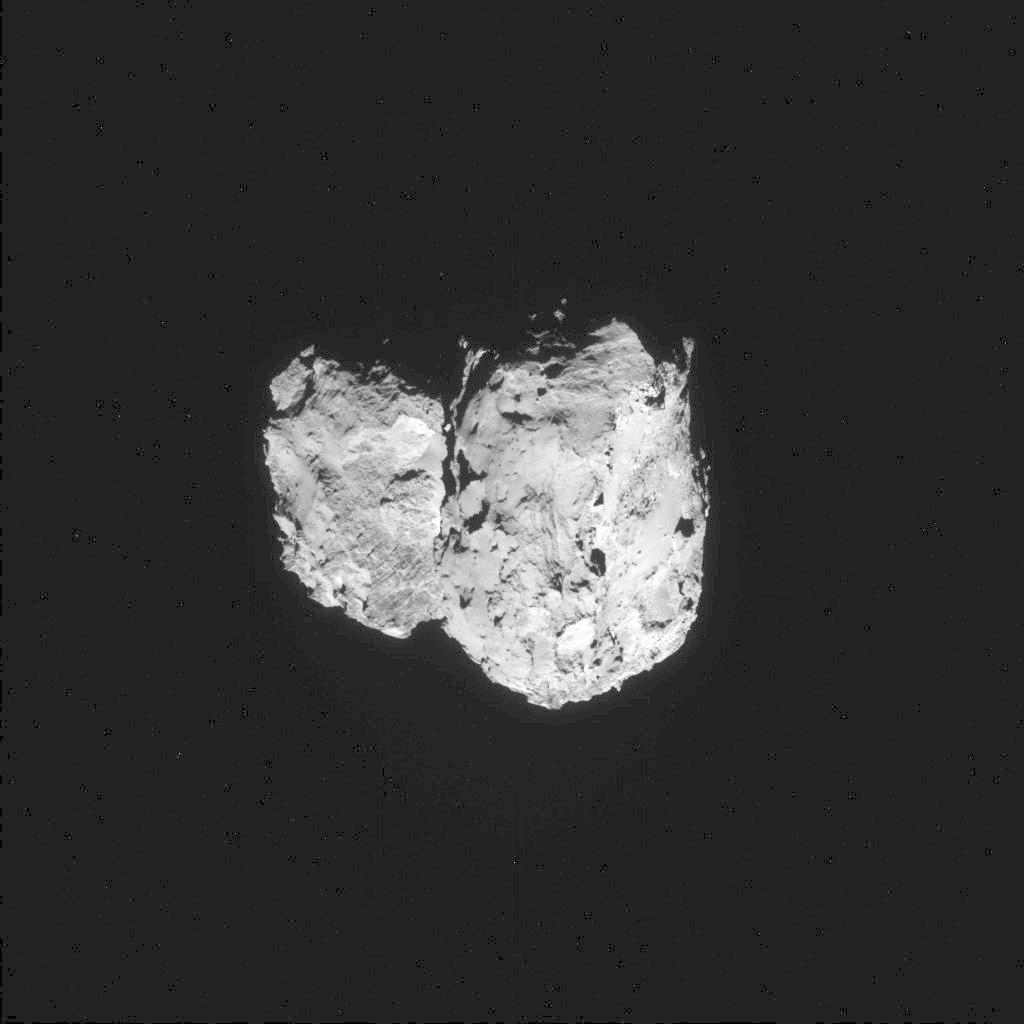 Dieses Bild des Kometen 67P/Churyumov-Gerasimenko wurde am 6. August 2014 von der Navigationskamera (NavCam) an Bord der Raumsonde Rosetta aus etwa 96 Kilometern Entfernung zum Kometen aufgenommen.