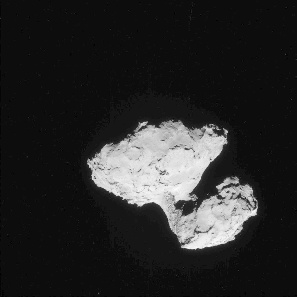 Dieses Bild des Kometen 67P/Churyumov-Gerasimenko wurde am 9. August 2014 von der Navigationskamera (NavCam) an Bord der Raumsonde Rosetta aus etwa 99 Kilometern Entfernung zum Kometen aufgenommen.