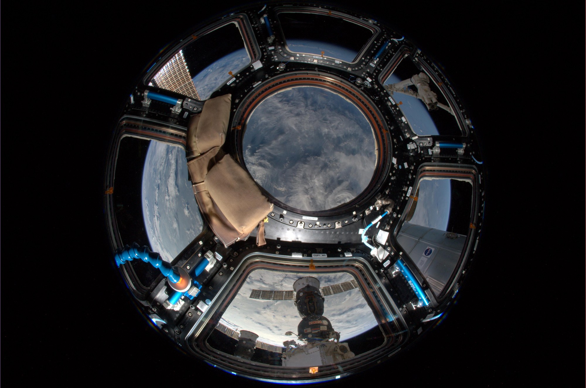 Die Erde "passt" in die Cupola der Internationalen Raumstation ISS; fotografiert von Alexander Gerst am 06. Juli 2014.