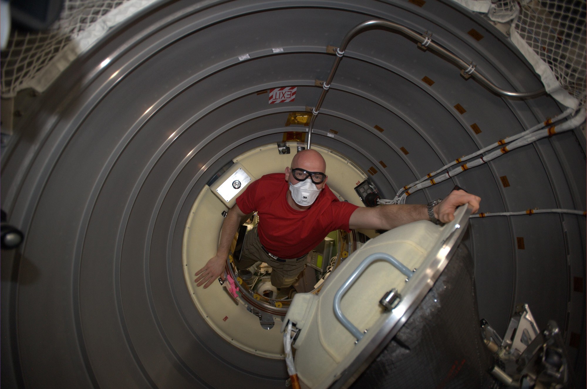 Nach dem erfolgreichen Docking des fünften und letzten Versorgungsraumschiffs ATV-5 Georges Lemaitre am 12. August 2014 an die Internationale Raumstation ISS öffnet ESA-Astronaut Alexander Gerst einen Tag später die Verbindungsluke. Zum Schutz vor möglichen Schwebeteilchen, die sich beim Start des ATV gelöst haben könnten und in die Augen oder die Lunge gelangen könnten, trägt er eine Maske.