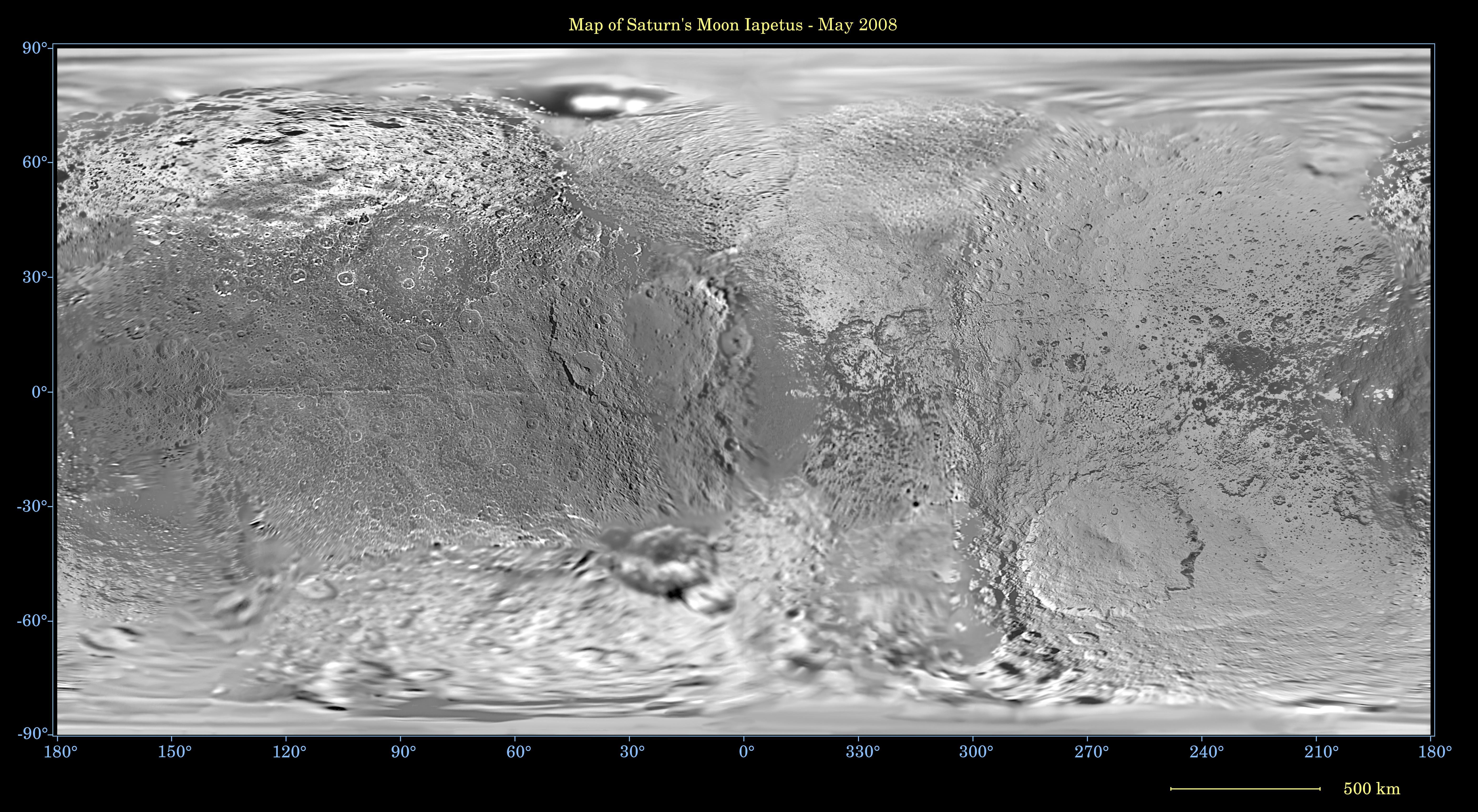 Die Abbildung zeigt die gesamte Oberfläche des Saturnmondes Iapetus, bei der die kugelförmige Oberfläche des Trabanten durch eine so genannte "einfache zylindrische äquidistante Projektion" auf eine rechteckige Fläche abgebildet wurde.