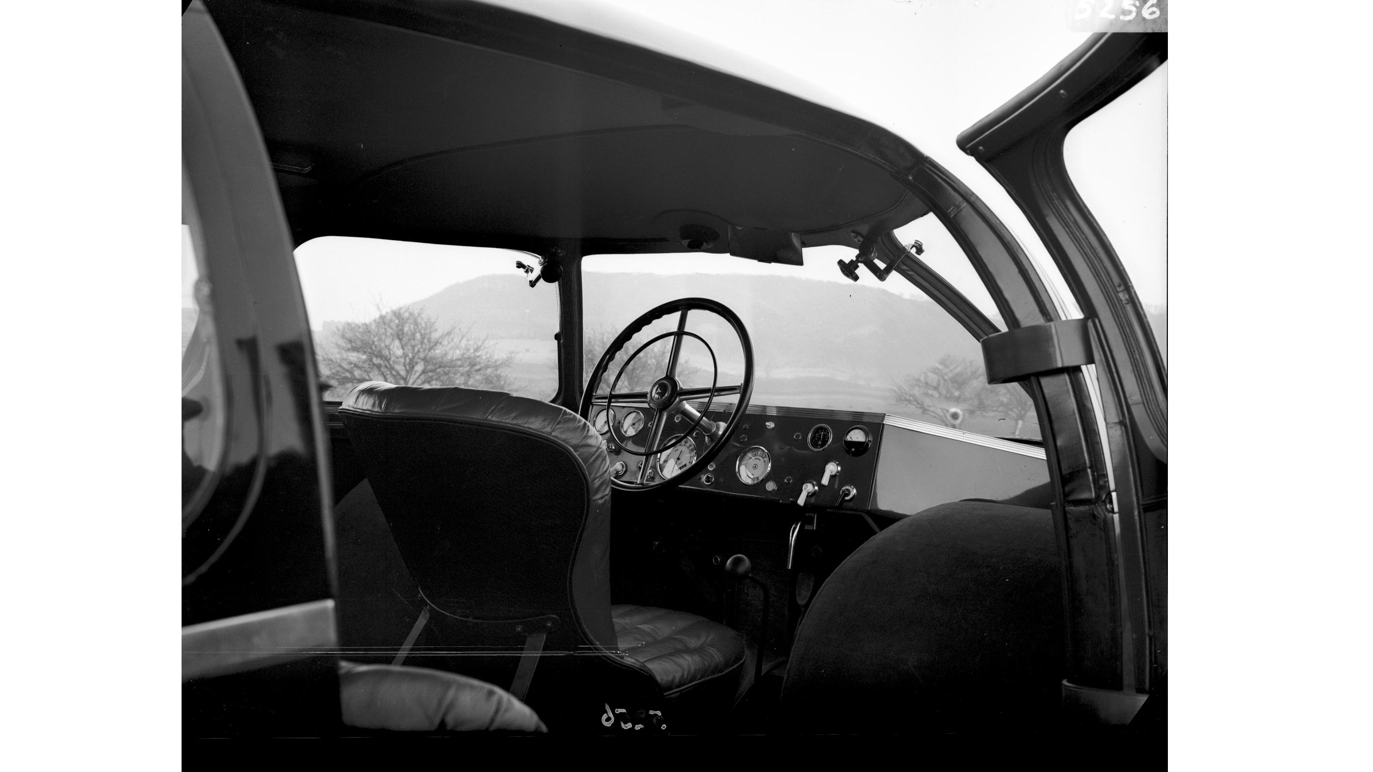 Das Lenkrad des Schlörwagens befand sich in der Mitte des Fahrzeugs. Insgesamt war Platz für sieben Personen.