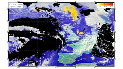 Mit VADUGS abgeleitete Säulenkonzentration der Vulkanasche in g/m² für eine Situation beim Ausbruch des isländischen Vulkans Eyjafjallajökull, 17.05.2010, 12:00 UTC. Die Prozessierung basiert auf MSG-SEVIRI Daten.