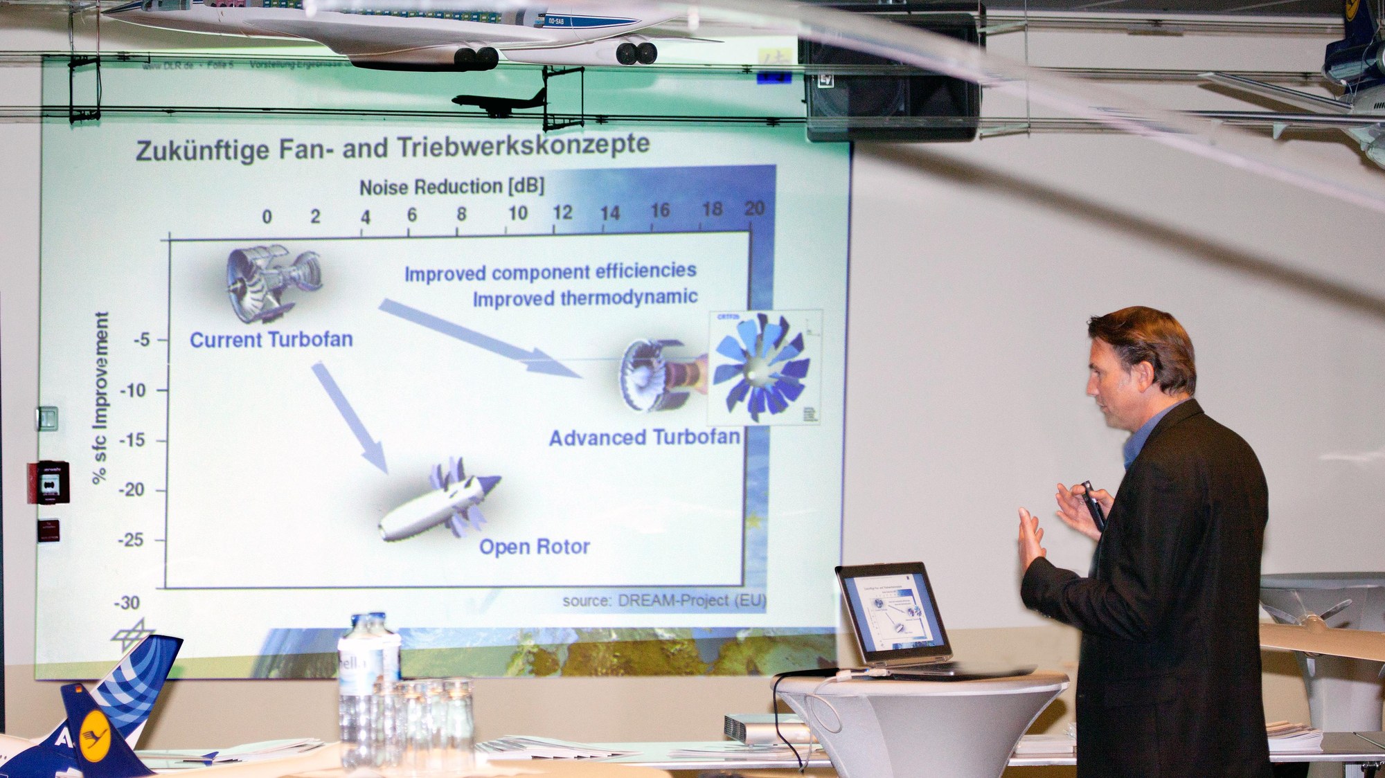 Projektleiter Dr. Andreas Schröder präsentiert das Projekt SAMURAI (Synergy of advances measurement techniques for unsteady and high Reynolds number aerodynamic investigations) und stellt die Ergebnisse vor. Die Forscher haben mit einer kombinierten optischen und akustischen Messtechnik einen Datenschatz angesammelt, der das Verständnis über Ursache und Ausbreitung des Strahllärms deutlich fördert.