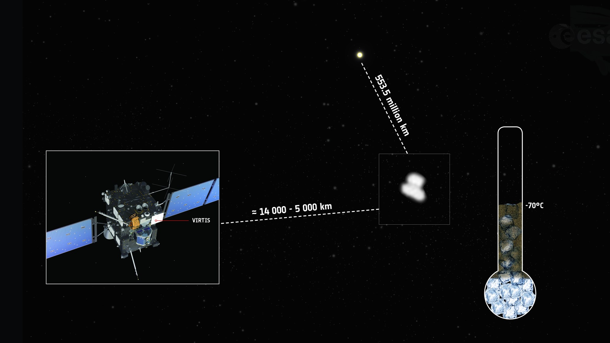 An Bord der ESA-Sonde Rosetta befindet sich das Spektrometer VIRTIS. Erste Temperaturmessungen zeigten, dass die Oberfläche von Komet Churyumov-Gerasimenko nicht vollständig von Eis, sondern von einem dunklen Staub bedeckt ist.