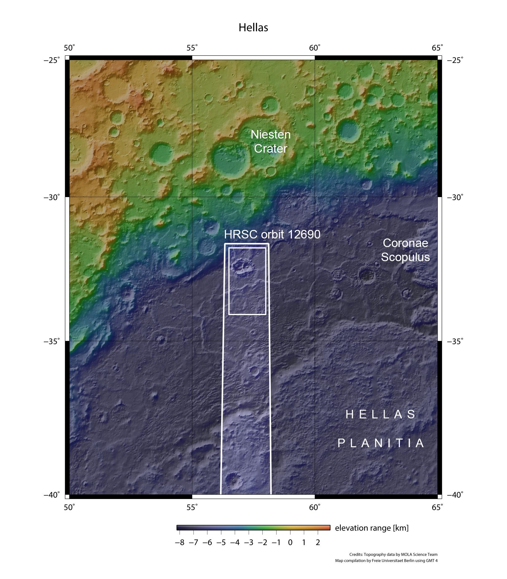 Hellas Planitia ist das am besten erhaltene und auch das größte bekannte Einschlagsbecken auf dem Mars. Sein Durchmesser beträgt mehr als 2200 Kilometer. An den tiefsten Stellen befindet sich der Grund von Hellas 8000 Meter unterhalb der Ebenen des südlichen Marshochlandes. Die vom DLR betriebene Stereokamera HRSC auf der ESA-Sonde Mars Express fotografierte den Nordwesten von Hellas bei außergewöhnlich guten atmosphärischen Bedingungen am 23. Dezember 2013.