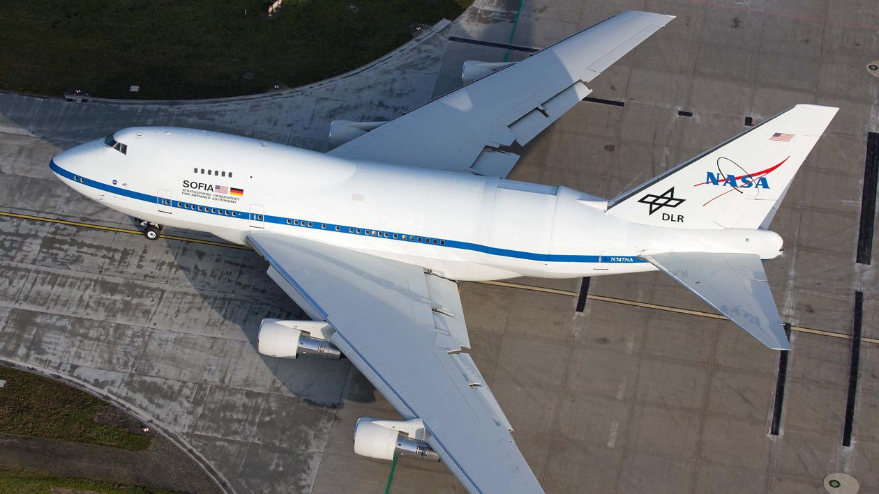 Auf dem Weg zum Start: SOFIA rollt auf dem Taxiway zur Startbahn des Hamburger Flughafens. Aus einem Helikopter hielt ein Fotograf diese Szenen fest.
