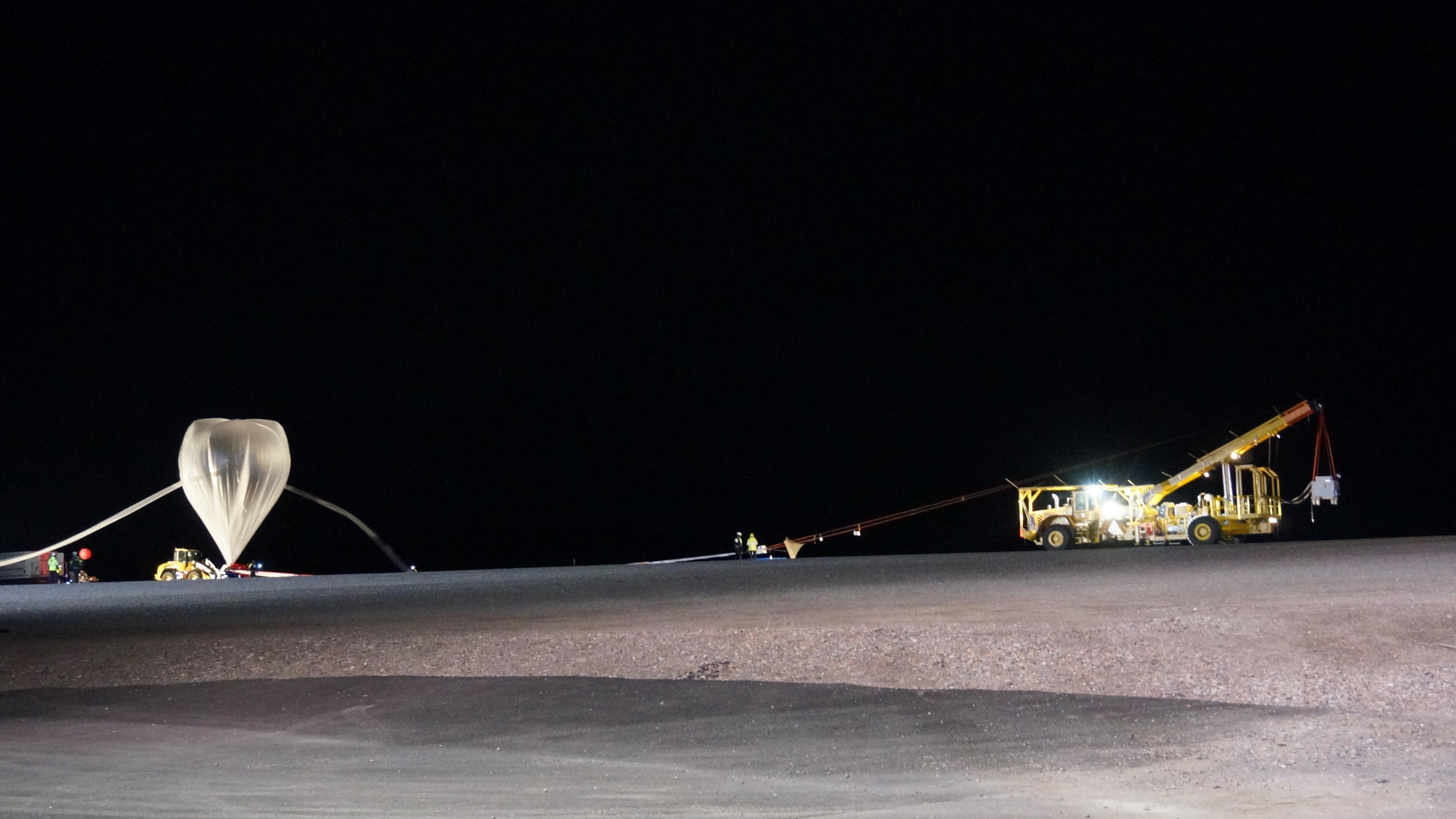 Der Ballon BEXUS 19 wird mit Helium gefüllt. Auf der rechten Seite steht der Startwagen "Herkules" mit der Gondel.